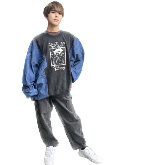 プリントのスウェットとデニムシャツをワイドにドッキング。