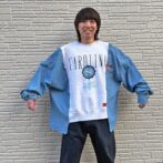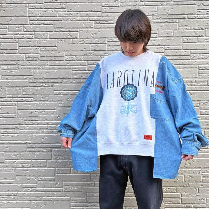 カレッジのスウェットとデニムシャツをワイドにドッキング。