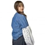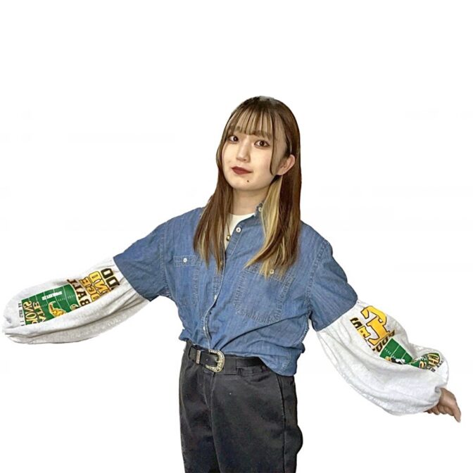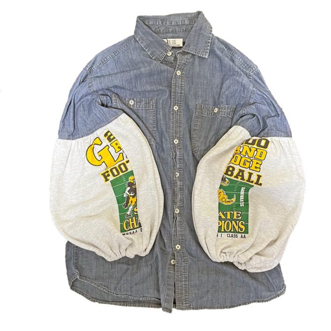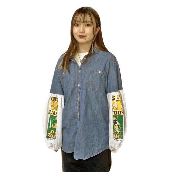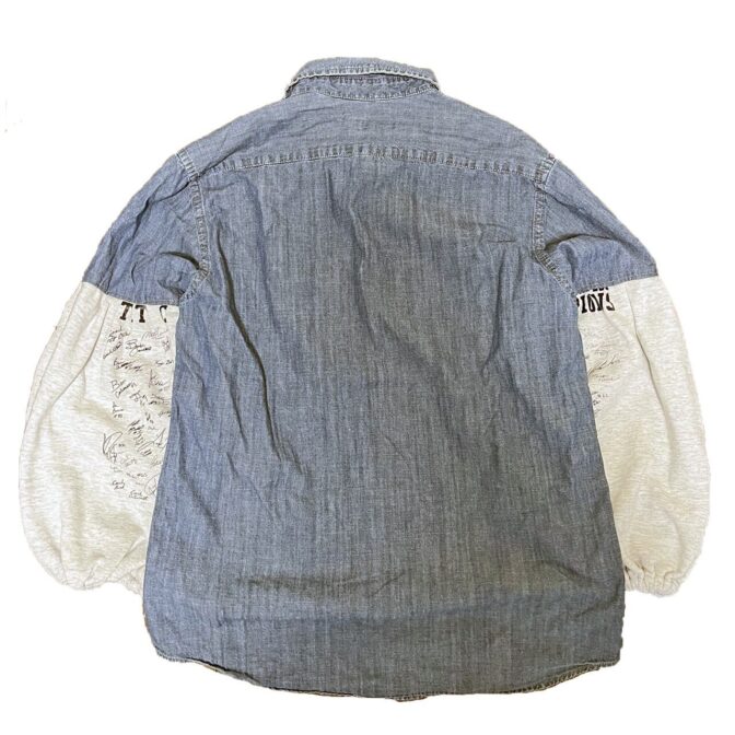 デニムシャツの袖にプリントのスウェットを使ってバルーン袖にリメイク。